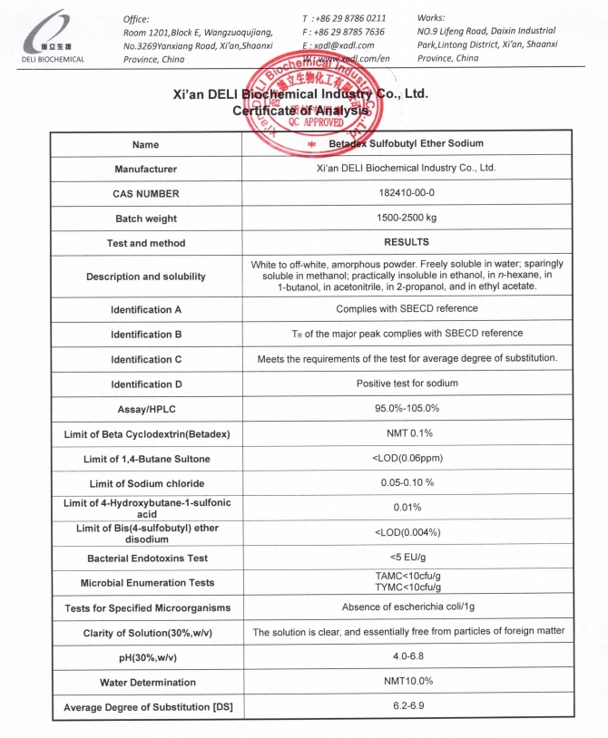 설포부틸 에테르 베타 사이클로덱스트린 나트륨 주입 등급의 신뢰할 수 있는 제조업체이자 공급업체인 Xi'an DELI는 초기 제제 개발부터 상업 생산까지 고객을 지원합니다.
